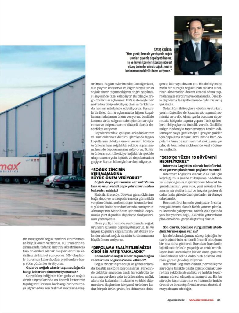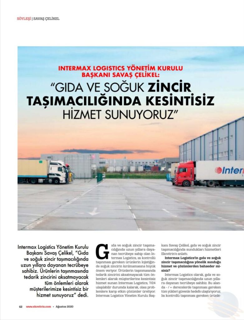 Intermax Logistics Yönetim Kurulu Başkanı Savaş Çelikel, “Gıda ve soğuk zincir taşımacılığında uzun yıllara dayanan tecrübeye sahibiz. Ürünlerin taşınmasında tedarik zincirini aksatmayacak tüm önlemleri alarak müşterilerimize kesintisiz bir hizmet sunuyoruz” dedi.